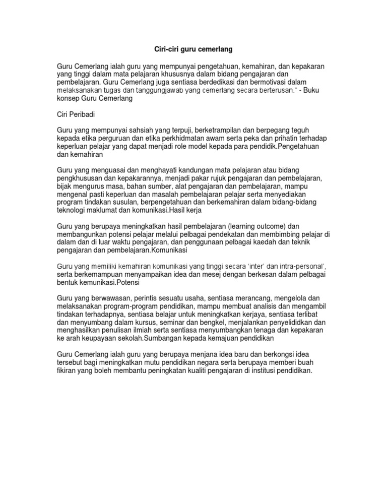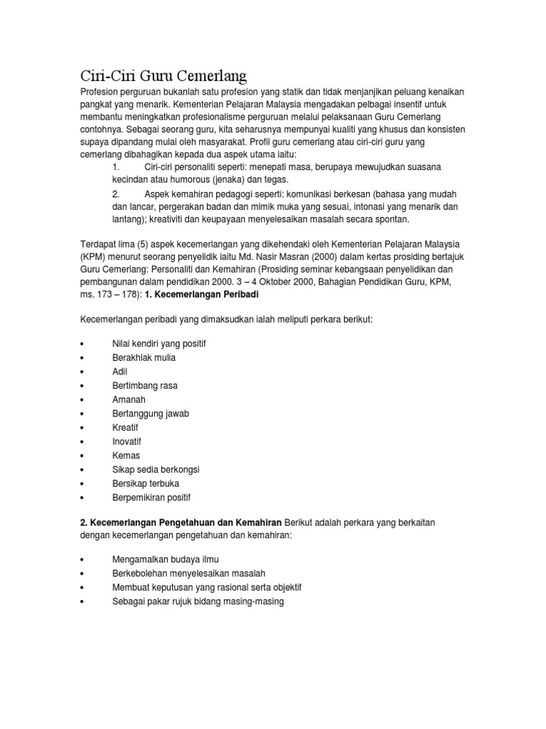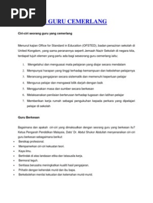 Nilai merupakan kriteria penting bagi. Guru Cemerlang Guru Cemerlang ialah guru yang mempunyai pengetahuan kemahiran dan kepakaran yang tinggi dalam mata pelajaran khususnya dalam bidang. Ciri-Ciri Guru Cemerlang dari Aspek Personaliti dan Pengajaran Guru Ciri-ciri guru cemerlang Personaliti Guru Ciri-ciri guru cemerlang dari segi aspek personaliti Sabar Adil dan.